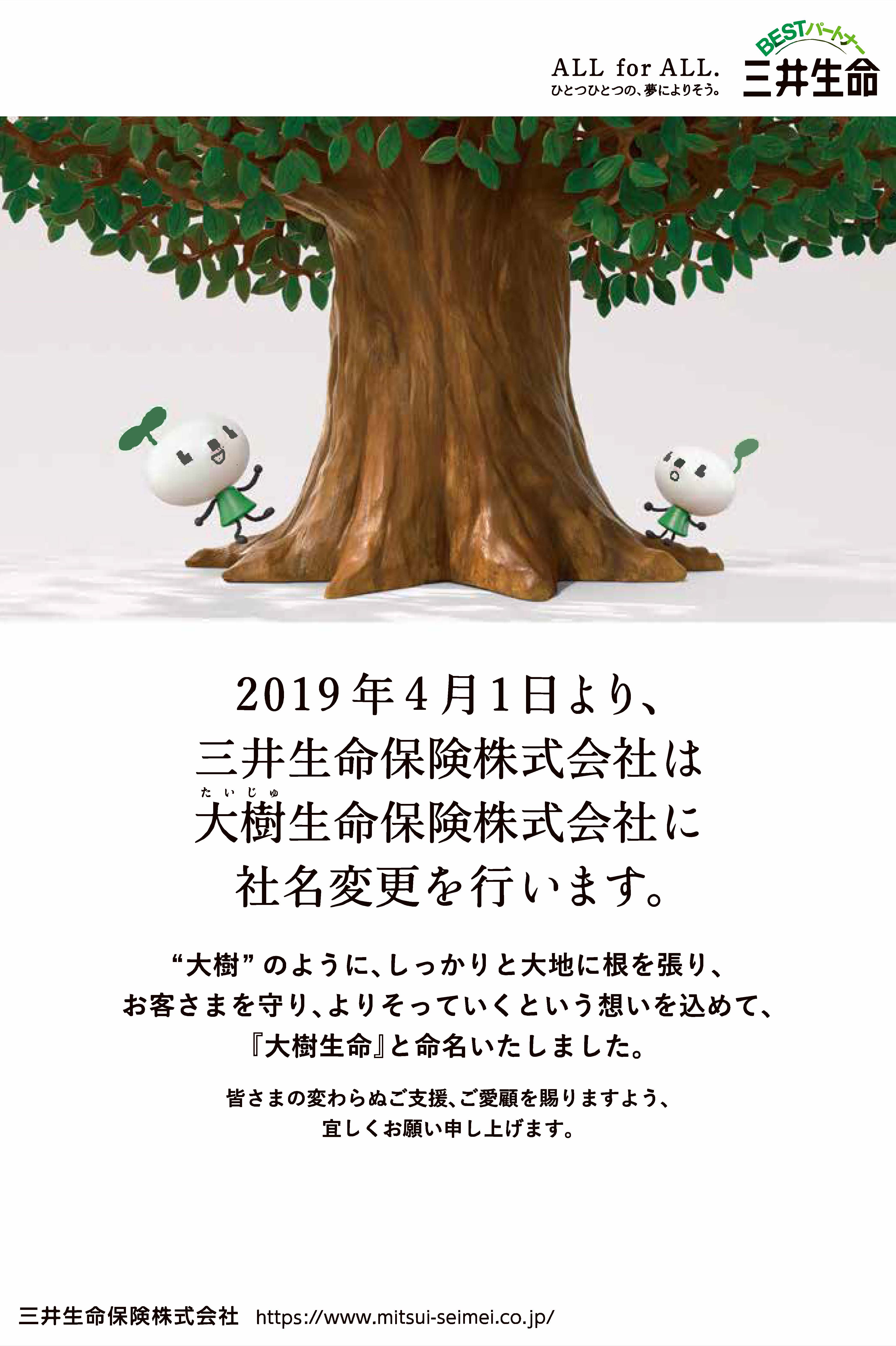当中央会の各種共済制度の受託会社である三井生命保険株式会社は、2019年4月1日より「大樹生命保険株式会社」に社名変更いたします。これにより契約内容やサービス内容などが変更されることはなく、今まで通りの体制ですのでご安心ください。また会員のみなさまに特段お手続きいただく必要もありません。