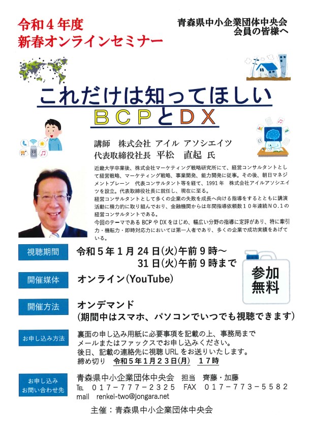 令和5年1月24日(火)~1月31日(火)の期間において、「令和4年度新春オンラインセミナー」を「オンデマンド(動画配信)」で開催いたします。